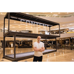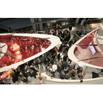 British architect Hugh Dutton created the Swire Properties Lounge at Art Basel Hong Kong, 2017. Emphasising natural light and organic materials, Dutton created a calm and elegant sanctuary featuring a symbolic, sculptural red flower ringed with floating ribbons and radial light-filtering petals. As the floating ribbons in the canopy cantilever towards each other they almost touch, creating a spatial tension that virtually encloses the space.
